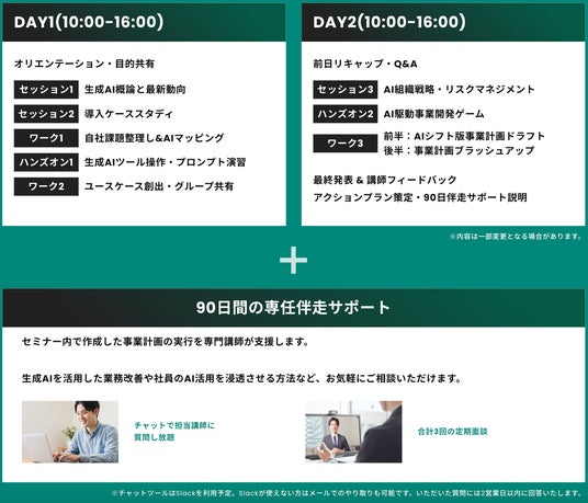 2日間のセミナー終了後も、生成AI活用に精通した「テックキャンプ」の専門講師が90日間にわたって計画の実行を支援します。