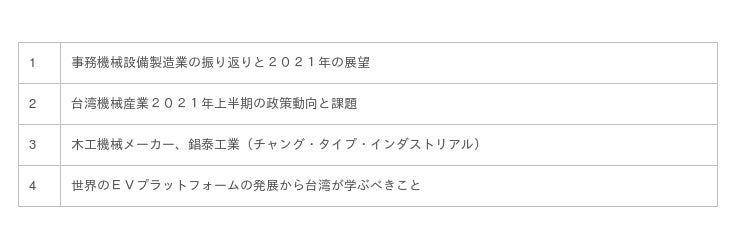 ワイズコンサルティング グループ(本社:中華民国台北市、代表取締役:吉本康志)は台湾機械業界専門誌「ワイズ機械業界ジャーナル」の8月第1週号を発行しました。今週号では、機械設備業界、台湾機械産業21年上半期の政策動向、木工機械メーカーのチャング・タイプ・インダストリアル、自動車業界について紹介します。