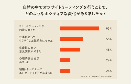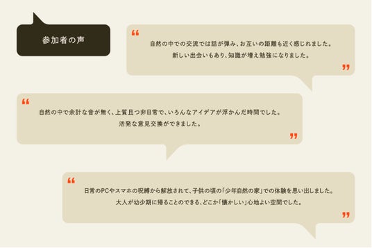 合宿参加者の93%からは「自然の中でコミュニケーションが円滑になった」と多くの反響をいただき(*1)、「今後も自然の中のオフサイトミーティングは必要だと思うか」の質問では、5段階中4以上の回答が83%(*2)とSANU 2nd Home合宿利用時に高い評価を得ています。