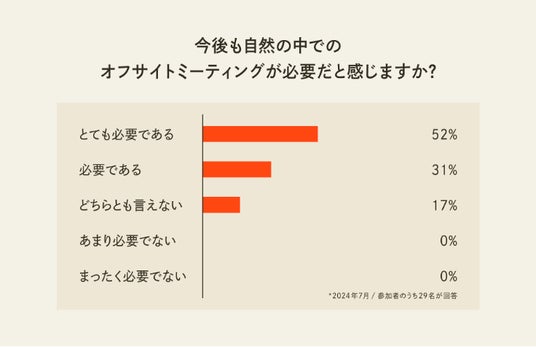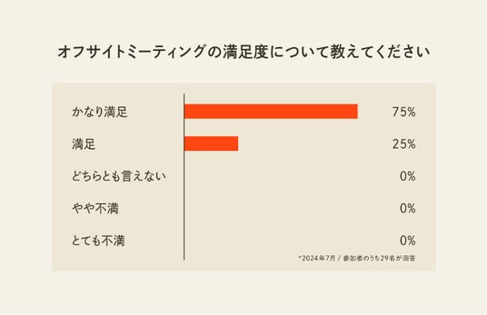 初対面が多い中、自然に囲まれリラックスできる環境が参加者同士のコミュニケーションを促進したと評価が高く、SANU 2nd Homeを利用したオフサイトミーティングの満足度は、アンケート回答者全員が「満足」と回答しました。