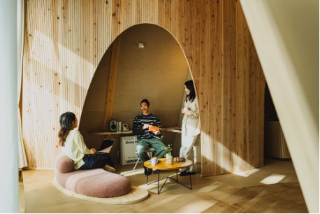 閉鎖的なオフィスとは異なり、自然に囲まれた環境で心身共にリフレッシュしながら、チームの自然なコミュニケーションを引き出します。