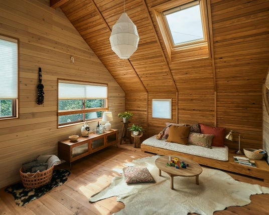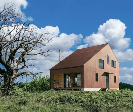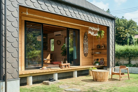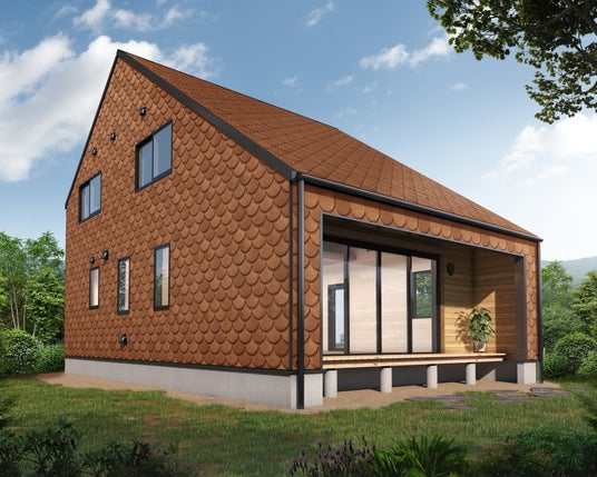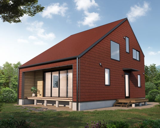 三角WONDER「間貫けのハコ」は、“マがあって、ヌケがある”をコンセプトに、2023年10月に発売されました。マとヌケが人と人の心をつなぎ潤す、“縁側みたいな家”です。個性的な外観印象と、国産杉にぐるっと囲まれたおおらかな室内空間が特徴です。