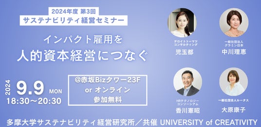 この度、多摩大学サステナビリティ経営研究所が主催、UNIVERSITY of CREATIVITYが共催として、サステナビリティ経営セミナー「インパクト雇用を人的資本経営につなぐ」を9月9日(月)に開催いたします。なお、このセミナーには一般社団法人グラミン日本(本社:東京都中央区、理事長:百野公裕)の理事である中川理恵が登壇いたします。