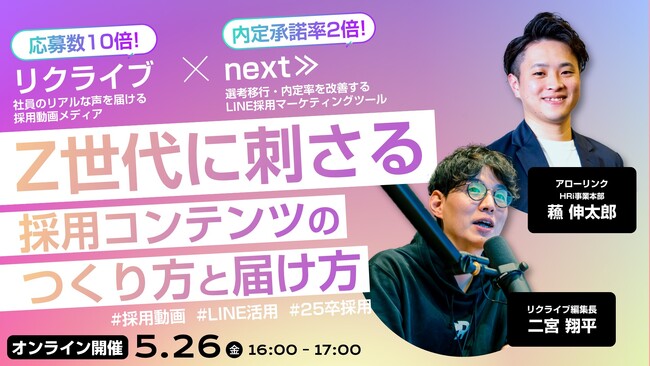 株式会社アローリンク(本社:兵庫県神戸市、代表取締役:蓬莱和真)と株式会社NKインターナショナル(本社:北海道帯広市、代表取締役:木田直樹)は、2023/05/26(金)に無料のセミナーを開催します。「Z世代に刺さる採用コンテンツのつくり方と届け方」と題し、Z世代に響く採用動画の作り方と活用法について解説いたします。