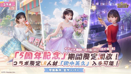 田中美久さんが5周年限定のLR人材としてゲーム内に登場!私服(初期姿)、OL(上級姿)、ドレス(超級姿)の3種類の姿が楽しめます。さらに、田中美久さんを獲得すると、彼女が女優として過ごす日常を描いたスペシャルショート動画が解放され、一人称視点で田中美久さんとの交流を体験できます。