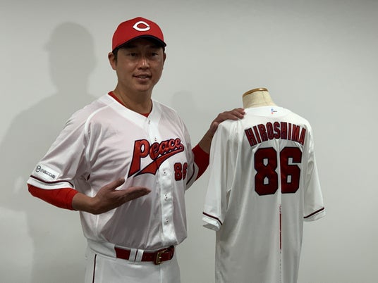 お披露目されたユニフォームは、通常「Carp」のロゴが入っている胸に「Peace」。