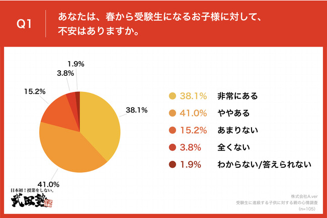 「Q1.あなたは、春から受験生になるお子様に対して、不安はありますか。」(n=105)と質問したところ、「非常にある」が38.1%、「ややある」が41.0%という回答となりました。