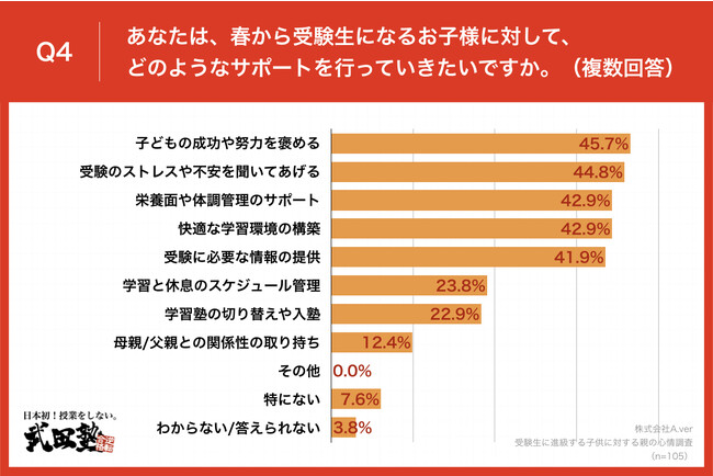 「Q4.あなたは、春から受験生になるお子様に対して、どのようなサポートを行っていきたいですか。(複数回答)」(n=105)と質問したところ、「子どもの成功や努力を褒める」が45.7%、「受験のストレスや不安を聞いてあげる」が44.8%という回答となりました。