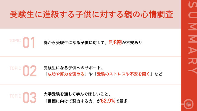 進級・進学シーズンである4月ですが、大学受験を控える新高校3年生の子どもを持つ親は、様々な不安や葛藤を抱えていることが分かりました。自身の不安はあるけれども、当然子ども自身へのサポートも考えており、子どもが自身の力を全力出し切って受験に挑めるように環境を整えてあげたいという意向が伺えました。それには、親のサポートだけではなく、塾の環境も重要視されており、親と同じように我が子に寄り添うような塾が選ばれるようです。受験の成功を願う親は多いですが、同様に「頑張った過程が大事」と考える親も多く、受験を通して我が子がいかに成長できるのかというところも塾選びのポイントなのかもしれません。