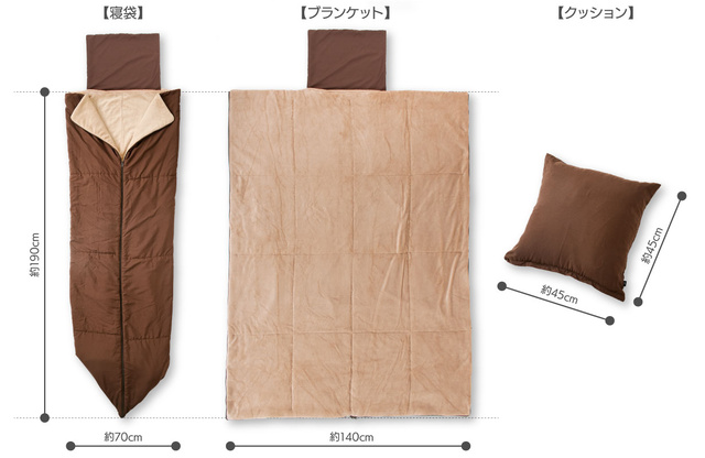 重量約1kgの軽量コンパクト設計!寝袋 ⇔ ブランケット ⇔ クッションへ簡単チェンジ!