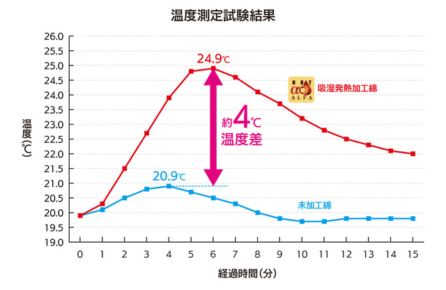 水分を熱に変換する吸湿発熱機能を有した"HOTαサーモ綿"を中綿に使用しているので、自社汎用綿と比較すると+4℃も暖かいんです!