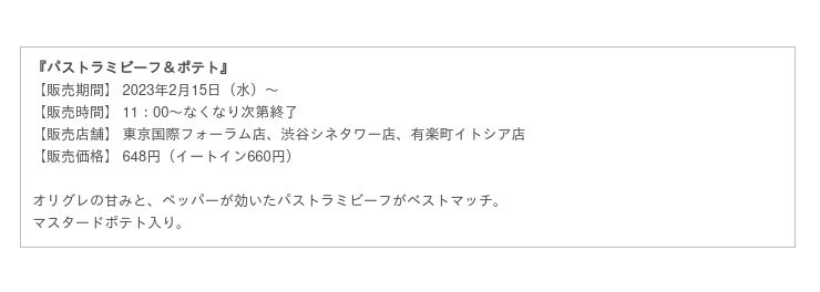 クリスピー・クリーム・ドーナツ・ジャパン株式会社(本社:東京都渋谷区、代表取締役社長:若月 貴子、以下:KKDJ)は、東京国際フォーラム店、渋谷シネタワー店、有楽町イトシア店限定メニューの新商品として『パストラミビーフ&ポテト』を2023年2月15日(水)より販売します。
