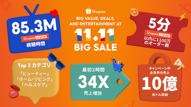 東南アジア・台湾で最大規模のEコマースプラットフォーム、Shopeeの日本法人であるショッピージャパン株式会社(本社:東京都千代田区 以下:ショッピージャパン)は、「11.11ビッグセール」における日本越境セラーの活躍を発表し、キャンペーンの開始後2時間でオーダー数34倍を記録しました