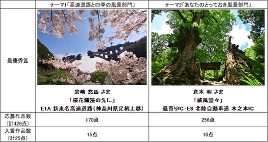 17回目となる今年のフォトコンテストでは、「高速道路と四季の風景部門」と「あなたのとっておき風景部門」の2つのテーマで作品を募集し、厳正なる審査を経て入選入賞作品を決定しましたので、お知らせいたします。