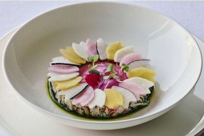 毎年春の訪れを告げる特別メニューとしてご好評をいただいている「Menu SAKURA」の魚料理をアップグレードした特別プランです。料理長の中村哲也(なかむら・てつや)が今年3月にフランス・シャンパーニュ地方、フィリップ・ミル シェフが料理長を務める二つ星レストラン「ル・パルク」を訪れた際に、一緒に考案した一皿をお楽しみいただけます。