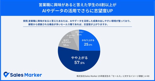 続いて、セールス職への興味が「非常にある」「ややある」と回答した方に、「あなたはAIやデータを活用した成果の出しやすい環境が整っており、顧客から感謝される機会が多いセールス職であれば、志望度が上がりますか。」(n=40)と質問したところ、「かなり上がる」が25.0%、「やや上がる」が57.5%という回答結果となりました。