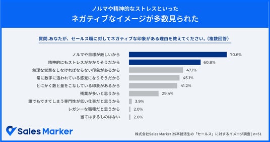 セールス職の印象に関して、「かなりネガティブ」「ややネガティブ」と回答した方に、「あなたが、セールス職に対してネガティブな印象がある理由を教えてください。(複数回答)」(n=51)と質問したところ、「ノルマや目標が厳しいから」が70.6%、「精神的にもストレスがかかりそうだから」が60.8%、「無理な営業をしなければならない印象があるから」が47.1%という回答結果となりました。