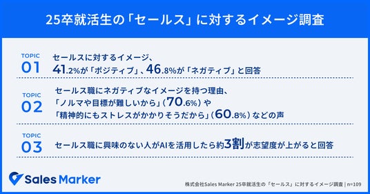 国内初※1「顧客起点」でおこなう新時代の営業手法「インテントセールス」を実現する『Sales Marker(セールスマーカー)』を開発・提供する株式会社Sales Marker(本社:東京都港区、代表取締役 CEO:小笠原 羽恭)は、2025年卒業の就活生(21~23歳)109名を対象に、25卒就活生の「セールス」に対するイメージ調査を実施しましたので、お知らせいたします。