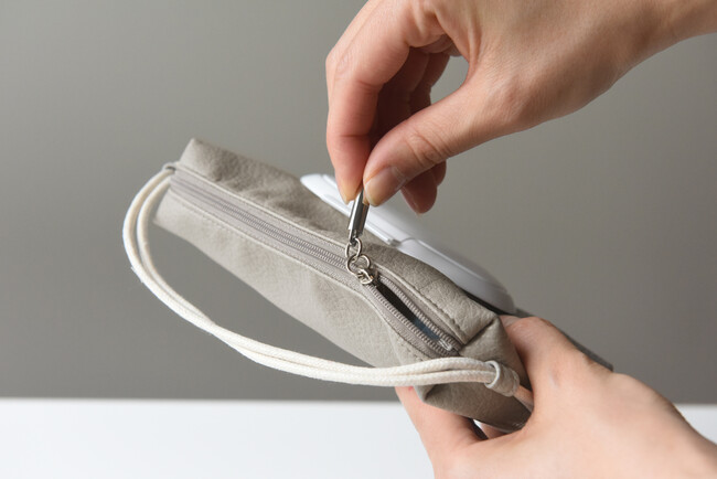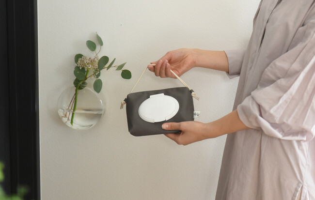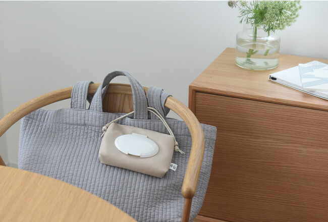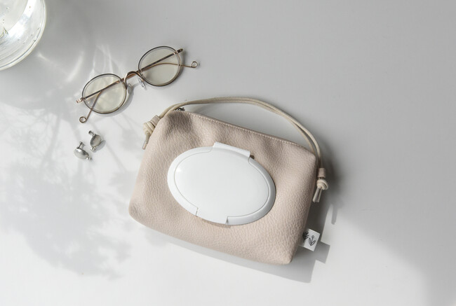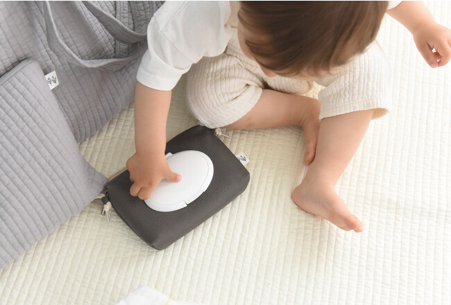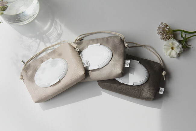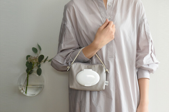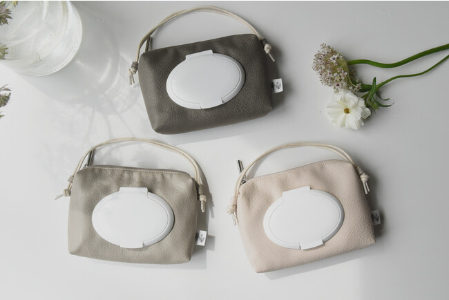 フェイクレザーを使った上品ルックスで、大人の女性好みにつくった「おしりふきポーチ」。アイボリー、ライトグレー、チャコールグレーの3色で、5/25(木)発売。