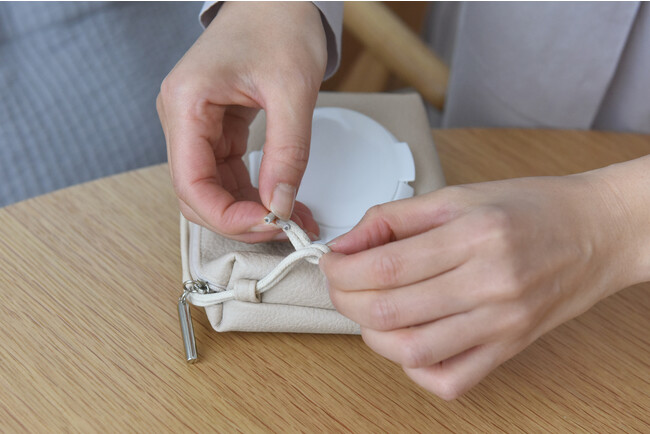 ロープ紐の結び目は解けるようになっているので、ママバッグのハンドルや、リュックの金具に取り付けたりと、手持ちのバッグにくっつけて持ち歩きもOK。