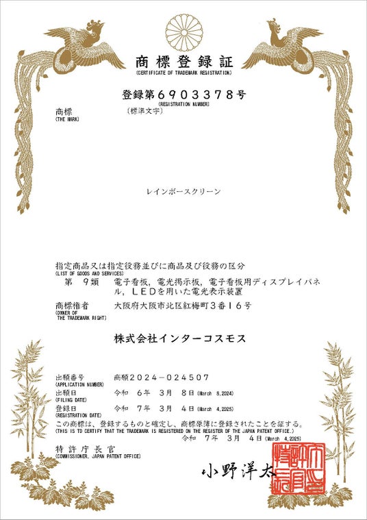 集客のための空間演出を手がける(株)インターコスモス(本社:大阪市北区、代表取締役社長:作道 洋介)の屋外対応置き型LEDビジョン【レインボースクリーン】が、特許庁にて商標登録されました。
