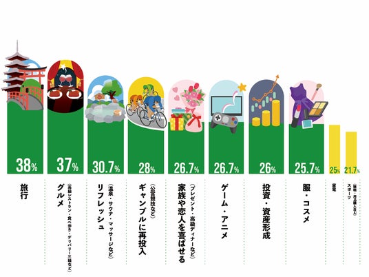 ・ 大穴を当てた時の払戻金で欲しい物に関する調査では、1位 旅行(38.0%)、2位 グルメ(37.0%)、3位 リフレッシュ(30.7%)という結果に。
