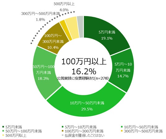 競輪・オートレースの投票ユーザーを対象に自身の過去最高払戻金額を調査したところ、10万円以上が64.0%と、6割以上が10万円以上の払戻金を得ていることが分かりました。さらに、全体の16.2%が100万円以上の払戻金を獲得していることが分かりました。