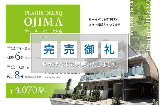総合不動産事業を展開する株式会社 木下不動産(本社:東京都新宿区、代表取締役社長:坂本 建士)は、都市型収益用マンション「プレール・ドゥーク 大島」の完売(全22戸、決済完了)をお知らせします。
