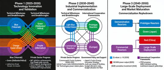 ● 同時に、Commonwealth Fusion SystemsのARC計画(2030年代初頭グリッド接続目標)、TAE TechnologiesのGoogle・Chevron投資(1.5億ドル)、Helion EnergyのMicrosoft電力購入契約(50MW、2028年予定)など、民間企業による商用化が急ピッチで進行中である。
