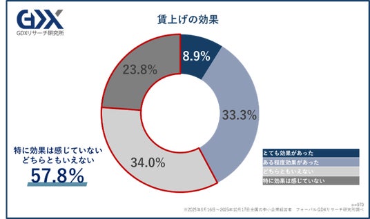 また、賃上げを実施する企業に対し、その効果を問う設問では、効果を感じる企業が約4割にとどまりました。最多の回答は「どちらともいえない」であり、現状では効果を見定めている企業が多いと推察されます。