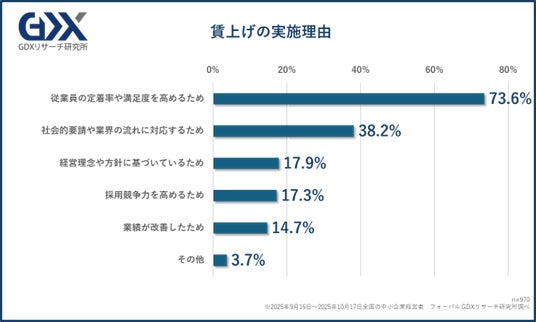 賃上げを実施したと回答した経営者が賃上げを実施した理由は、「従業員の定着率や満足度を高めるため」が73.6%と群を抜いて多い回答となりました。次いで、「社会的要請や業界の流れに対応するため」(38.2%)、「経営理念や方針に基づいているため」(17.9%)、「採用競争力を高めるため」(17.3%)という結果でした。