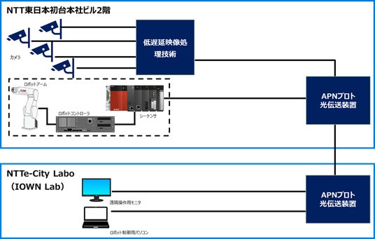 三菱電機株式会社(本社:東京都千代田区、執行役社長:漆間 啓、以下「三菱電機」)と、東日本電信電話株式会社(本社:東京都新宿区、代表取締役社長:澁谷直樹、以下「NTT東日本」)は、IOWN(※1)におけるオール・フォトニクス・ネットワーク(以下「APN(※2)」)を活用したユースケース創出に向けて、三菱電機の産業用ロボットとAPNプロトタイプ機(※3)を接続することで、産業用ロボットの遠隔研修の実現に向けた共同実証を行いました。APNの特徴である「低遅延性」「ゆらぎゼロ」を活かすことで、物理的に離れた環境を1つの環境のように統合することに加え、IOWN APN関連技術である「低遅延映像処理技術(※4)」を活用し、通常の対面研修と同様の操作性を実現しました。2024年1月24日より、本検証環境をNTT東日本がNTTe-City Labo(※5)(所在地:東京都調布市)に開設した「IOWN Lab(※6)」にて公開しました。