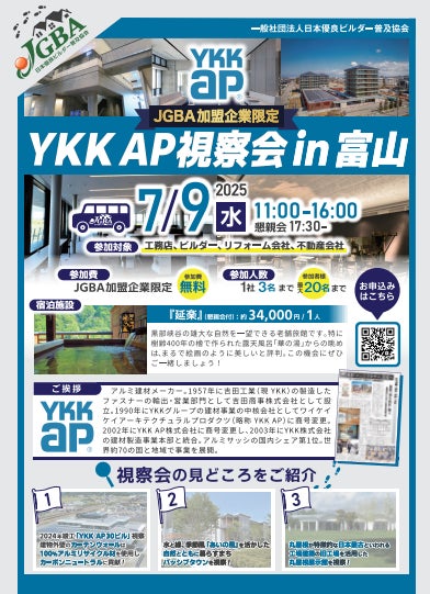 今回の視察会開催企業はアルミ建材メーカーからスタートし、2003年にYKK株式会社の建材製造事業本部と統合。世界約70の国と地域で事業を展開するYKK AP株式会社で決定しており、同社の竣工ビルやパッシブタウン等の施設を実際に視察する予定です。2025年7月9日(水)に開催が決定しており、今回はJGBA会員企業限定の視察会です。