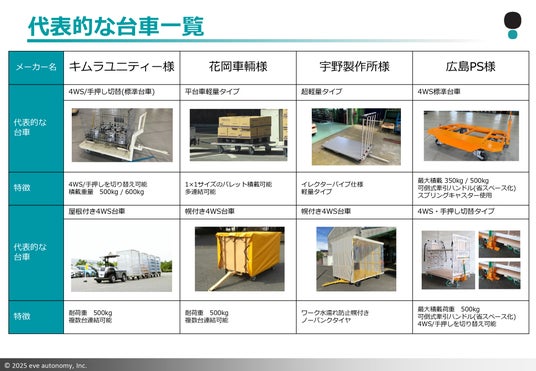 株式会社eve autonomy(イヴ・オートノミー、本社:静岡県磐田市、代表取締役CEO:星野 亮介、以下「eve autonomy」)は牽引台車の多様な導入実績とカスタマイズ事例をまとめた資料「牽引台車活用事例」の更新版を、本日より当社公式ウェブサイトにて無料公開いたしました。