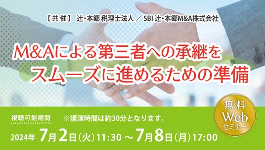 辻・本郷 税理士法人(本社:東京都新宿区、理事長:徳田孝司)は、SBI 辻・本郷M&A株式会社(本社:東京都千代田区、代表取締役:小林堅悟)と共催で「M&Aによる第三者への承継をスムーズに進めるための準備」セミナーを開催いたします。本セミナーでは、中小企業白書を読み解き、最新のM&Aの動向や事例、成功させるために備えるべきことを、中小企業診断士がわかりやすく解説します。「まだまだ先のことだから関係無い」と思っている経営者様にも、ぜひご参加いただきたいセミナーです。