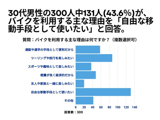 30代男性の300人を対象とした「バイクを利用する主な理由は何ですか?」というアンケートで131人(43.6%)が「自由な移動手段として使いたい」という結果になりました。