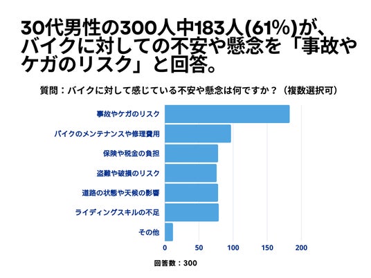 30代男性の300人を対象とした「バイクに対して感じている不安や懸念は何ですか?」というアンケートで183人(61%)が「事故やケガのリスク」という結果になりました。