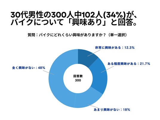 30代男性の300人を対象とした「バイクにどれくらい興味がありますか?」というアンケートで102人(34%)が「バイクについて興味あり」という結果になりました。