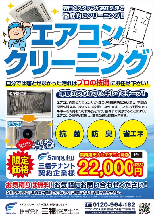 株式会社三福快適生活(本社:愛媛県松山市、代表取締役:二宮晃輝)は、エアコンの稼働が本格化する夏を目前に控え、プロの技術による「エアコンクリーニングサービス」の受付を強化いたします。家庭内の快適な空気環境を保つために、特別価格10,000円(税別)/台にてご提供します。