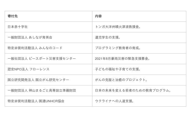 ウクライナ人道支援やトンガ火山噴火支援など世界的な紛争や災害での犠牲者支援、未来を担う子どもたちの教育・福祉への支援を中心に寄付を行いました。