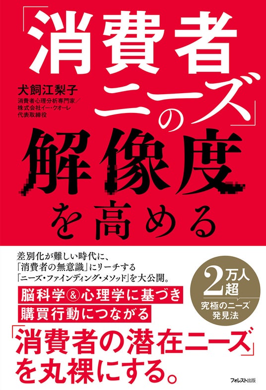 フォレスト出版株式会社(所在地:東京都新宿区、代表取締役:太田 宏)は、新刊『「消費者ニーズ」の解像度を高める』(犬飼江梨子 著)を2024年11月10日(日)以降順次発売いたします。本書は、脳科学と心理学を用いて消費者の潜在ニーズにリーチし、マーケティングや商品戦略に応用する新しい手法「ニーズ・ファインディング・メソッド」を紹介。差別化が困難な現代の市場で、消費者の無意識に隠れた「本当のニーズ」を解き明かし、売れるコンセプトづくりの秘訣を解説しています。