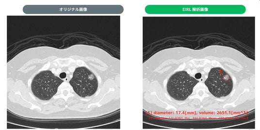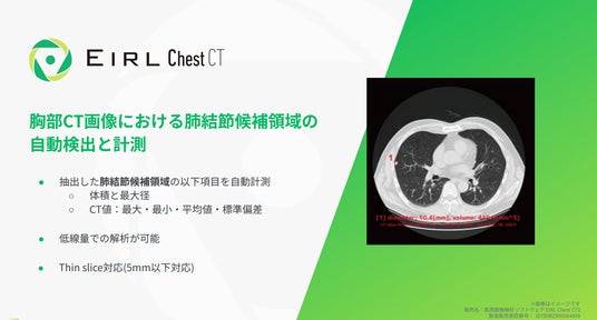 エルピクセル株式会社(本社:東京都千代田区、代表取締役:鎌田富久、以下「エルピクセル」)は、胸部CT画像から肺結節候補域を検出し、医師の診断を支援するEIRL Chest CTについて、「医薬品、医療機器等の品質、有効性及び安全性の確保等に関する法律(医薬品医療機器等法)」に基づき、2025年3月25日付で医療機器製造販売承認(販売名:医用画像解析ソフトウェア EIRL Chest CT2、製造販売承認番号:30700BZX00064000)を取得し、販売を開始いたしました。
