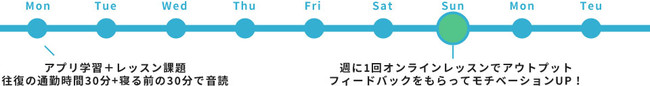 1週間の学習イメージとしては、毎日アプリ自主学習とレッスン課題を行い、週に1回のオンラインレッスンでアウトプットを行います。Teacherから適切なフィードバックをいただけるので、次週の学習に活用してください。