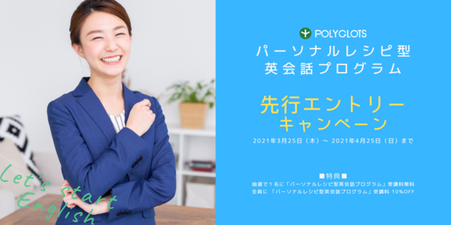 株式会社ポリグロッツ(本社:東京都新宿区、代表取締役:山口隼也)は、2021年4月26日受付開始の新サービス『パーソナルレシピ型英会話プログラム』の先行エントリーキャンペーンを開始しました。エントリーをいただいた方の中から抽選で1名様にプラン無料受講、全員に受講料10%OFFにてご提供させていただきます。また、受付開始まで毎週5名の方にAmazonギフト10,000円分が当たる「先行エントリー記念Twitterキャンペーン」も同時開催します。