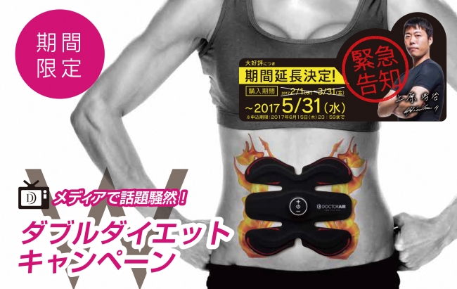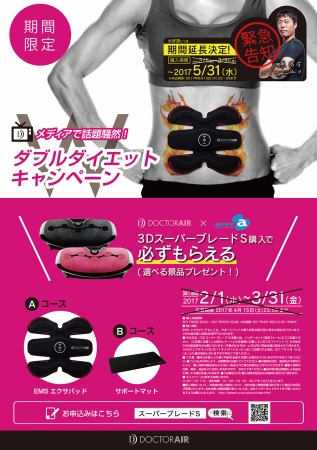 株式会社ドリームファクトリー(本社:大阪市北区 代表取締役:井上 馨)が展開しているトータルボディケアブランド『ドクターエア』では、ご好評につき、現在実施中の〔ドクターエア 3D スーパーブレードS〕の購入特典キャンペーン【Wダイエットキャンペーン】を、2017年5月31日(水)まで、全国のドクターエア直営店、家電量販店他にて延長実施いたします。