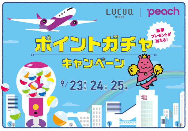 大阪駅直結のファッションビル「ルクア大阪」 (大阪市北区梅田)は、 9月23日(金・祝)~9月25日(日)の期間、LUCUAメンバーズカード会員&Peach LINEお友だち限定でショッピングに使える「LUCUA メンバーズカードポイント」や海外旅行に使える「ピーチポイント」(共に最大10,000円分)があたるポイントガチャキャンペーンを開催いたします。(ハズレなし)また、Peach からは就航先である韓国【8月28日(日) から運航再開:大阪(関西)-ソウル(仁川)】や台湾、西日本旅客鉄道株式会社からは関西空港と新大阪・京都を結ぶ特急「はるか」の特設パネル展示を開催。
