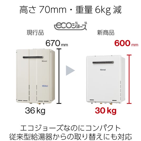 現行品の高効率ガス給湯器「エコジョーズ」(RUXC-E3200W)と比べて、本体の高さは70mm、重量は6kg削減したコンパクト設計。「エコジョーズ」でありながら、従来型の32号業務用ガス給湯器(RUXC-A3200W)と同じ筐体寸法のため、既設品からの取替もスムーズです。当社は、「エコジョーズ」業務用ガス給湯器の普及を通じて、CO2排出量の削減に貢献します。