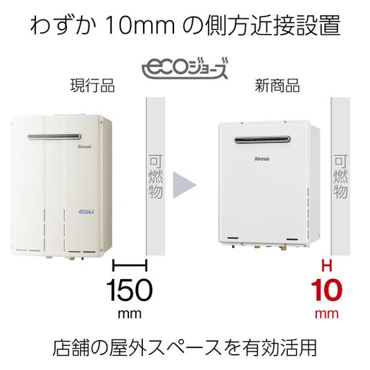 RUXC-E3201Wは、食品衛生法の改正により厳格な衛生管理が求められる食品事業者に向けて、最高85℃の高温出湯機能を追加します。また、現行品と比べて側方の可燃物離隔距離を改善。最小10mmの側方近接設置に対応することで、店舗や事務所の限られた屋外スペースを有効活用できます。さらに、高さ70mm減のコンパクト設計により、従来型ガス給湯器から「エコジョーズ」へのスムーズな取替を実現。省エネ性にも優れたRUXC-E3201WがCO2排出量の削減に貢献します。