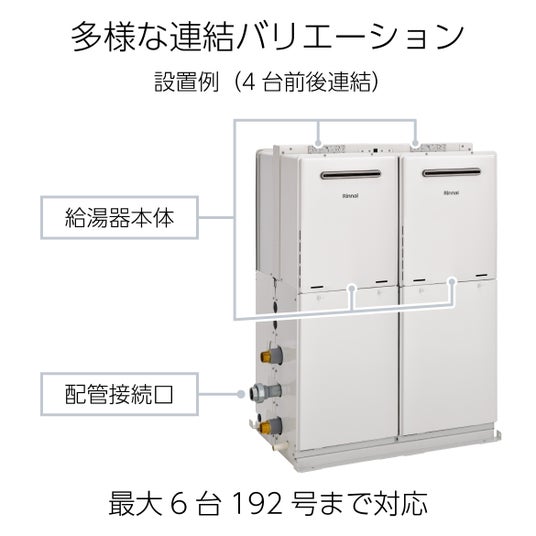 RUXC-Eシリーズは給湯器の連結設置に対応。2台連結ケーブル(別売)により手間なく64号(2台)、また、システムユニット(別売)により最大192号(6台)の給湯能力が確保できます。