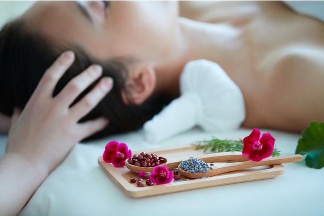 夏から秋へ、朝晩の気温差が激しい季節の変わり目は、自律神経が影響を受けやすいと言われています。寒暖差疲労が生じやすく、睡眠不足や頭・目の重さ、だるさといった慢性的な疲労のケアに、AO スパ&クラブでは睡眠に特化したトリートメントメニューを考案いたしました。初めにリラックス効果が高く、不眠・イライラを鎮めるラベンダーと、自律神経のバランスを整えるゼラニウムにお塩を混ぜたフットスクラブで、足先からリラックスしていただきます。続いて、頭皮マッサージをメインに普段疲労が溜まりがちな背中や首・デコルテのマッサージを行い、老廃物の排出を促します。疲労回復が期待できるあずきやラベンダー、カモミールをブレンドしたアイマスクを目元に、ハーブボールを肩に置いて、AO スパらしく旬の素材と自然の恵みを生かしたユニークな手法で究極のリラクゼーションへと導きます。頭皮マッサージをじっくり行うことで、頭の筋肉がほぐれ睡眠の質を高め、眼精疲労までアプローチします。日頃から眠りの浅さや不眠、パソコンやスマホで目を酷使し眼精疲労にお悩みの方におすすめの今秋限定のトリートメントで、心身からリフレッシュしてみてはいかがでしょうか。